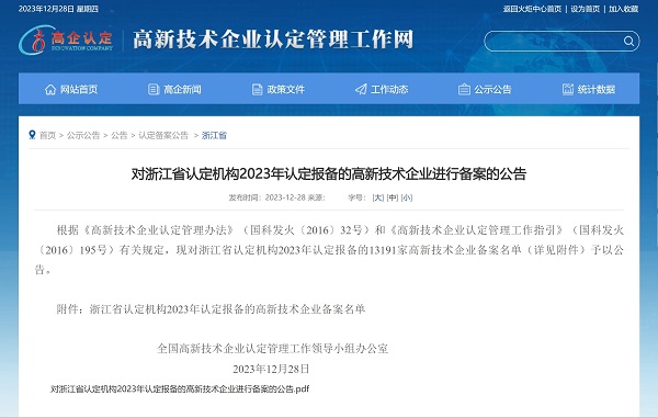 2023年12月28日,全國高新技術(shù)企業(yè)認(rèn)定管理工作領(lǐng)導(dǎo)小組辦公室發(fā)布《對(duì)浙江省認(rèn)定機(jī)構(gòu)2023年認(rèn)定報(bào)備的高新技術(shù)企業(yè)進(jìn)行備案的公告》,中國能源工程集團(tuán)有限公司(以下簡稱“中國能源工程集團(tuán)”)所屬中清能源(杭州) 有限公司...